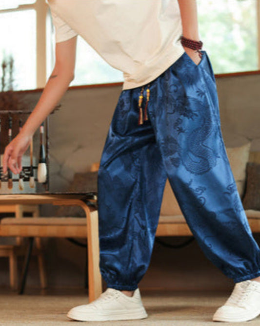 Herrebukser Harem med Drageprint, Mellemhøj Talje med Snøre, Smalle Ben