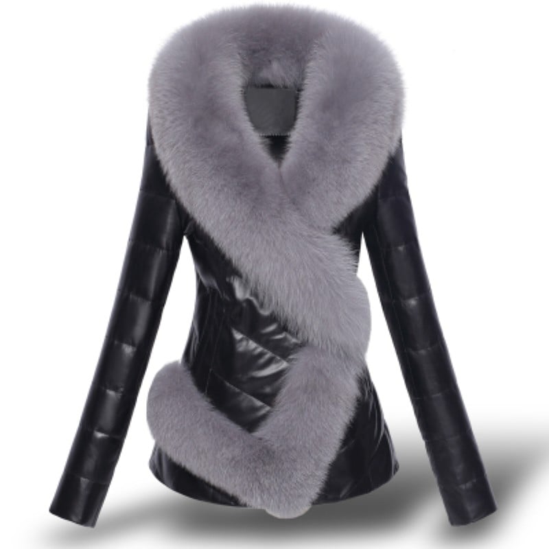 Kort vinterfrakke til kvinder med krave i imiteret pels og knaplukning foran