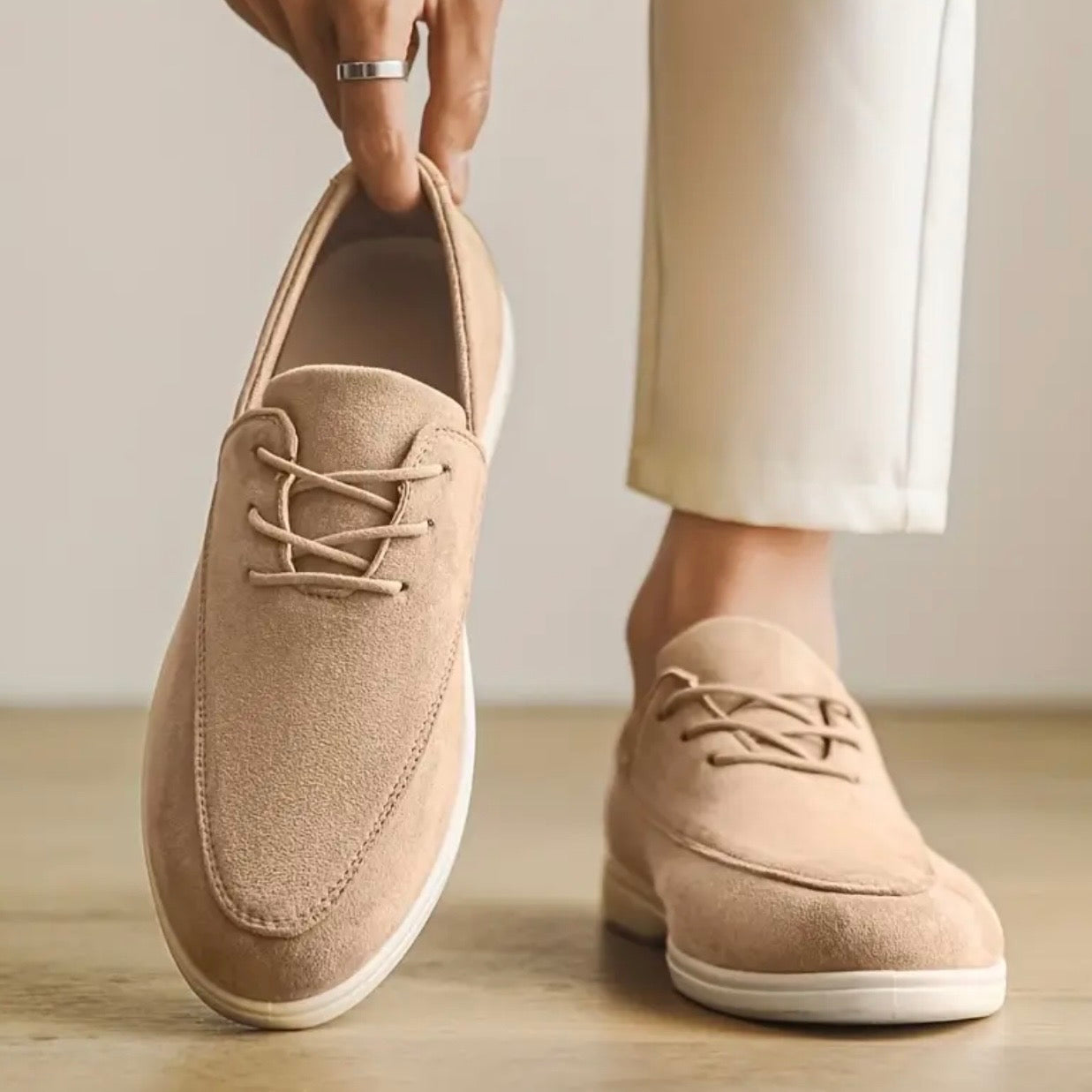 These loafers feature a suede upper with hand-stitched details and a padded insole for practical comfort throughout the day. The lightweight rubber sole offers non-slip grip while maintaining flexibility during walks or extended standing. Designed with a breathable inner lining, they are ideal to pair with chinos, jeans, or summer suits, offering a balance between structure and versatility.