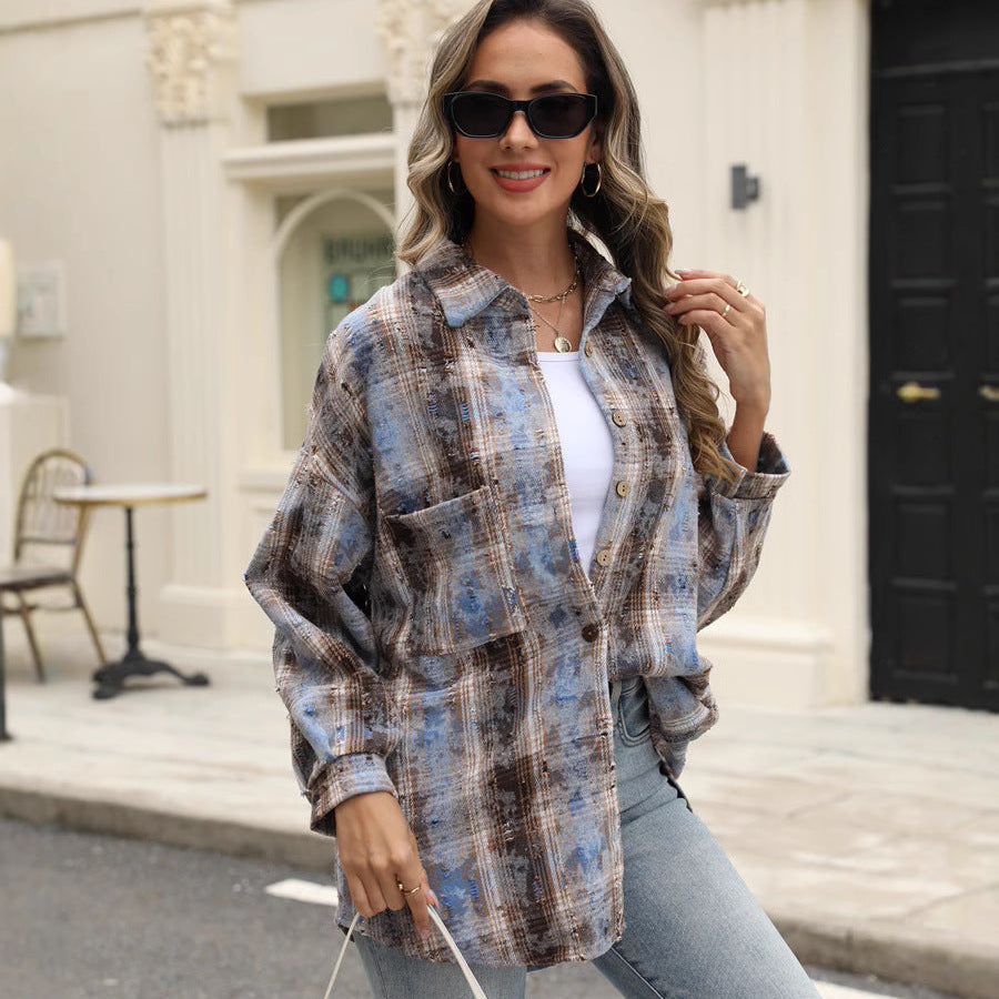 This women's plaid shirt combines the classic checkered pattern with modern details, featuring ripped inserts and a functional front pocket. Designed with long sleeves and a button closure, it can be worn alone or layered as a light outer layer. Available in various colors, this shirt offers versatility in pairing with jeans, pants, or skirts.